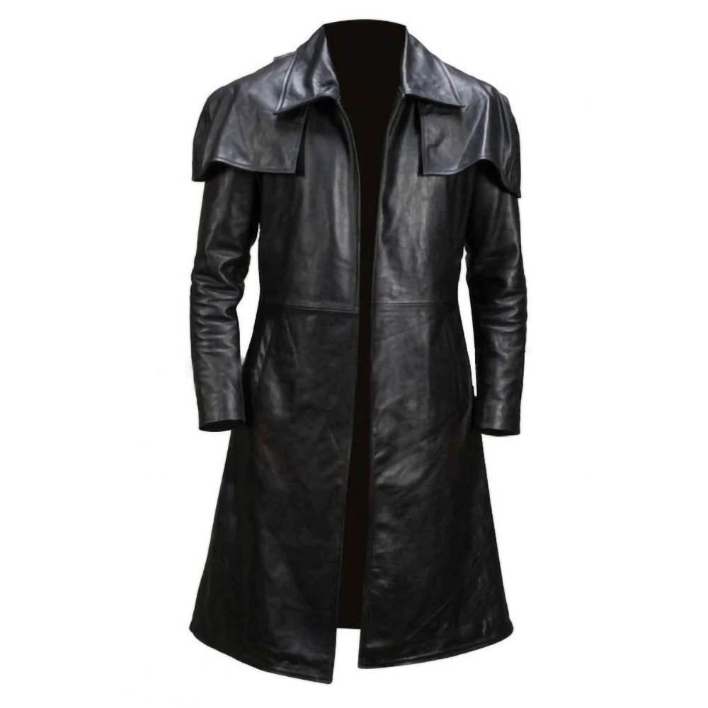 A7 Black Trench Coat Genuine Leather Mens Jacket.
