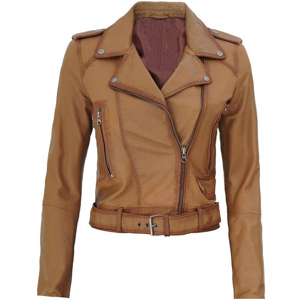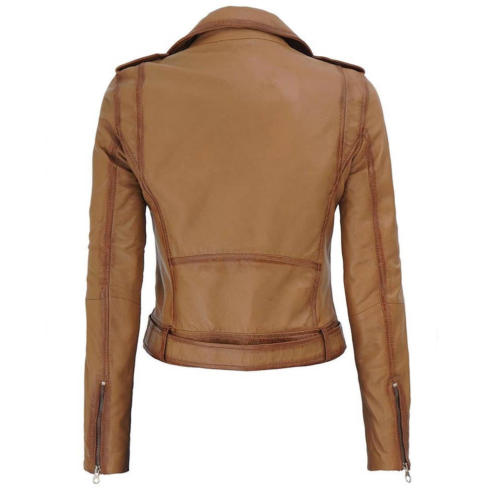 Cropped Biker Wax Beige Streetwear Leather Jacket Womens.
