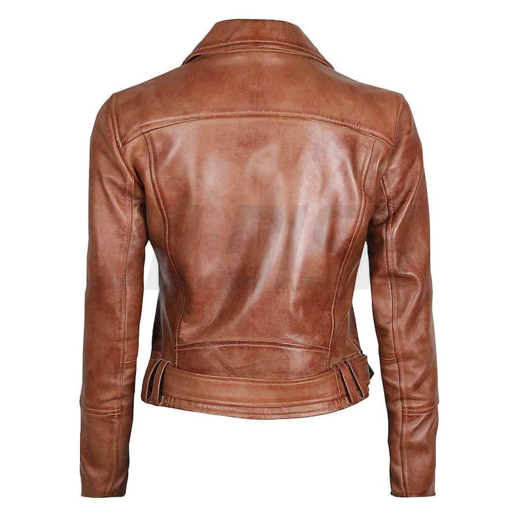 Cropped Style Wax Tan Womens Biker Genuine Leather Motorcycle Jacket.