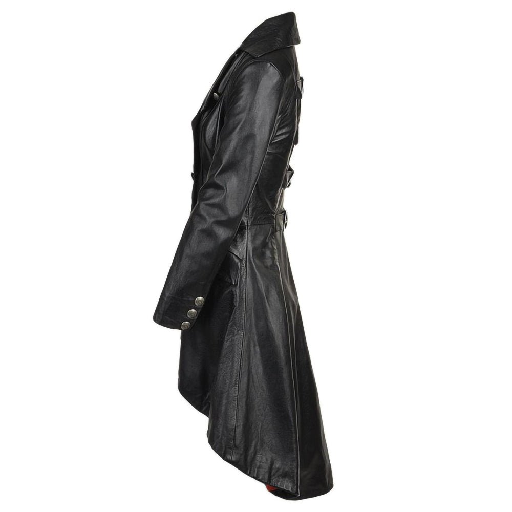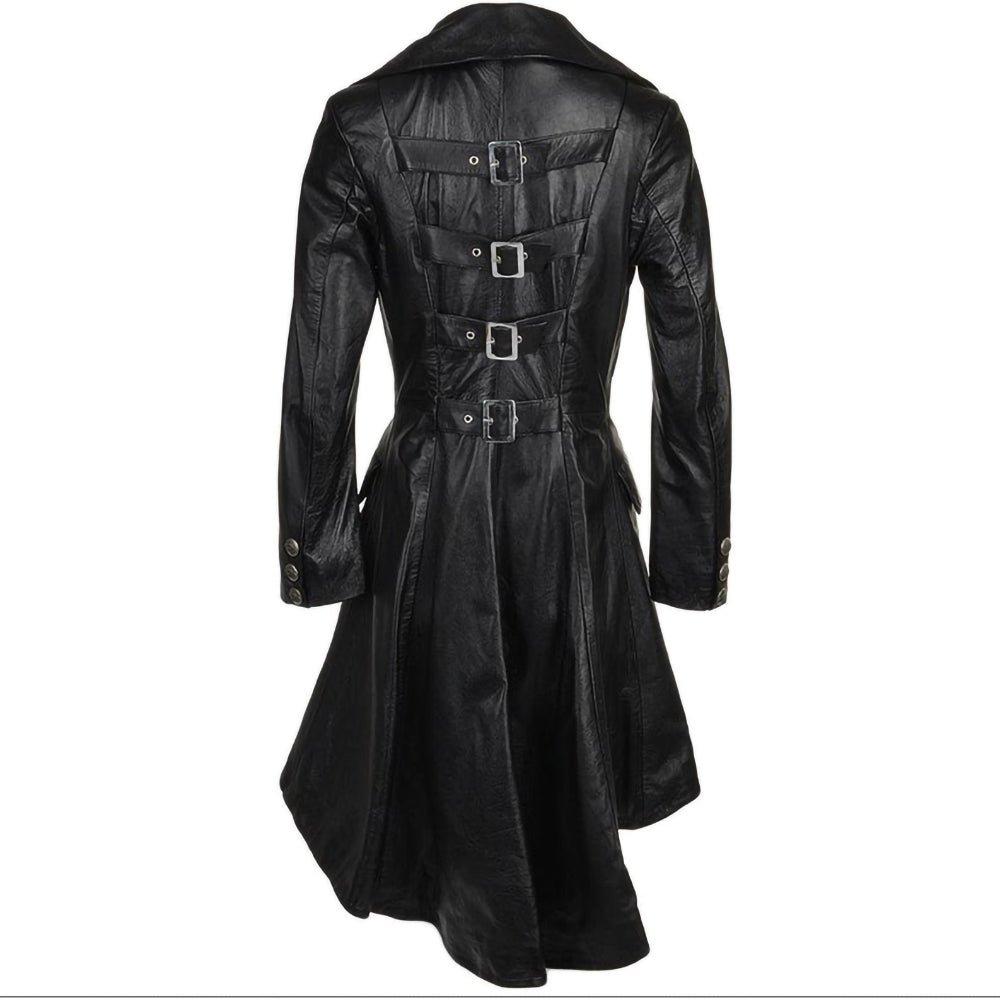 Double Breasted Back Belted Flapper Black Real Leather Long Coat Womens