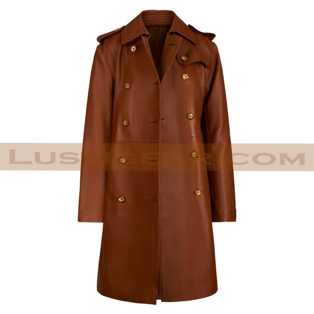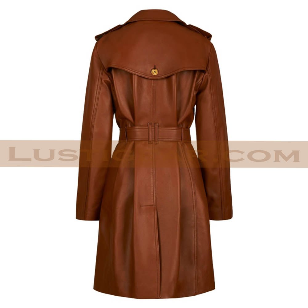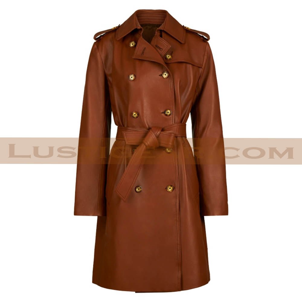 Double Breasted Belted Trench Leather Coat Women’s Brown Long Jacket.
