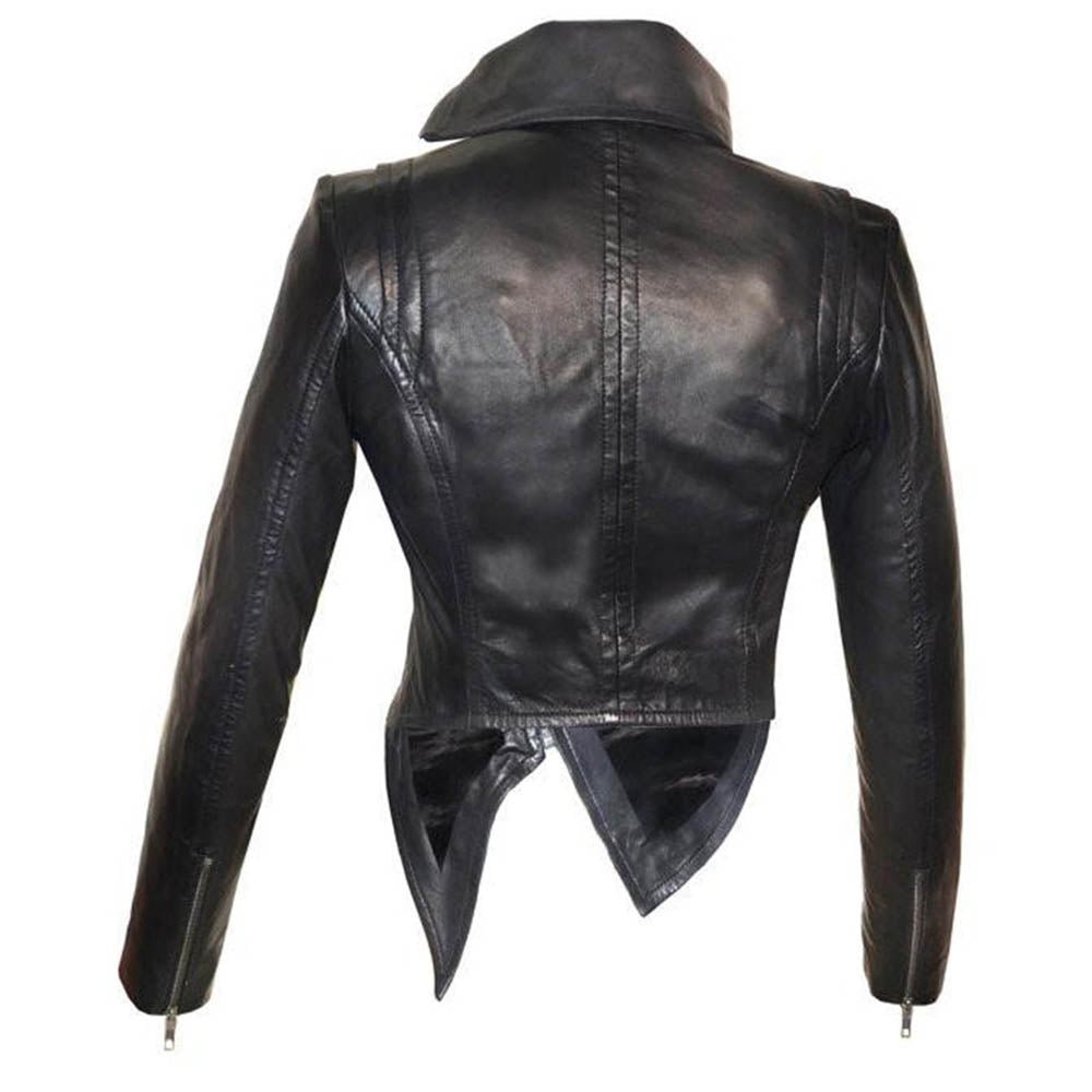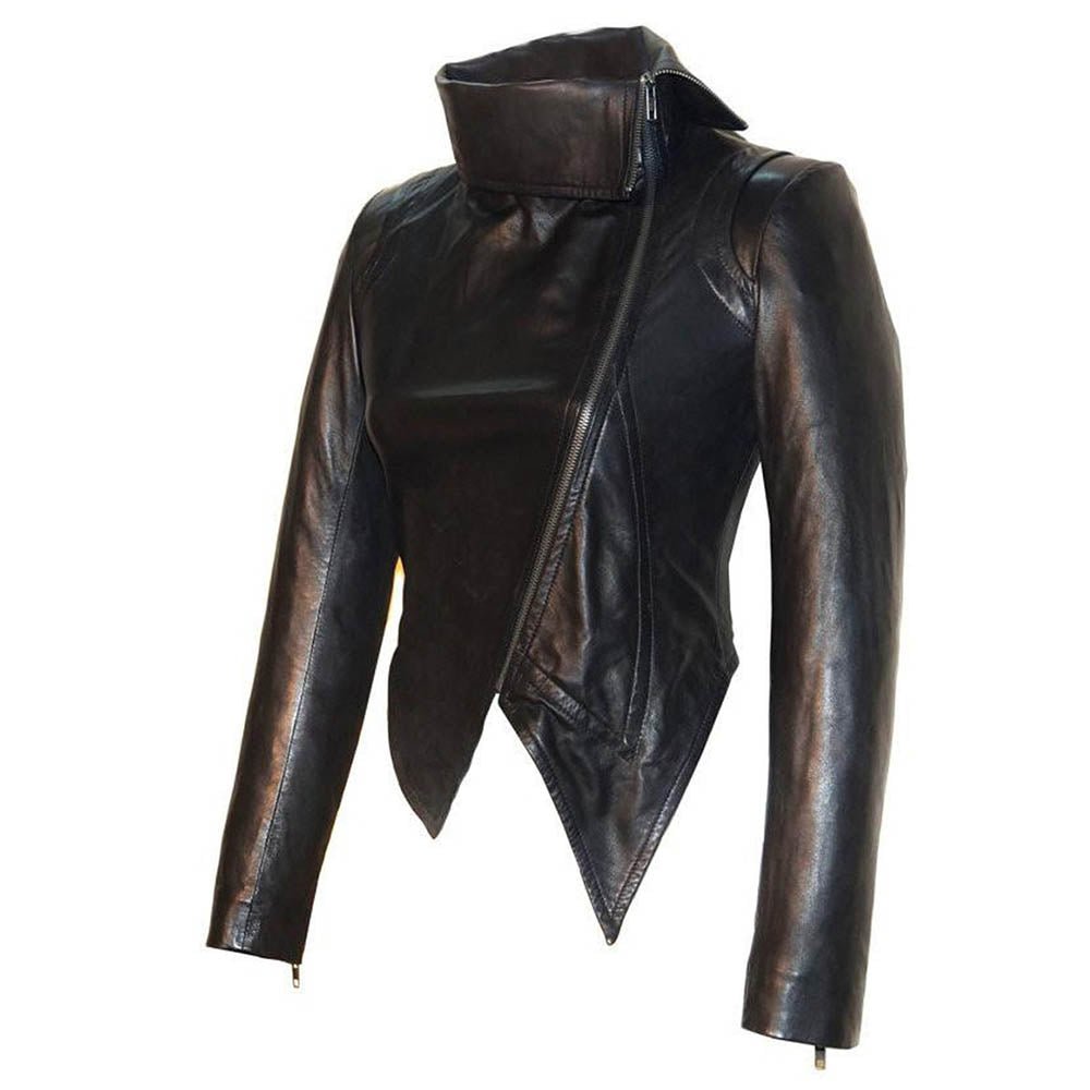 High Collar Designer Style Cross Zip Black Real Leather Jacket Womens .