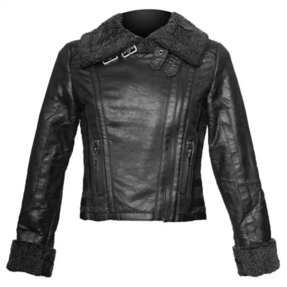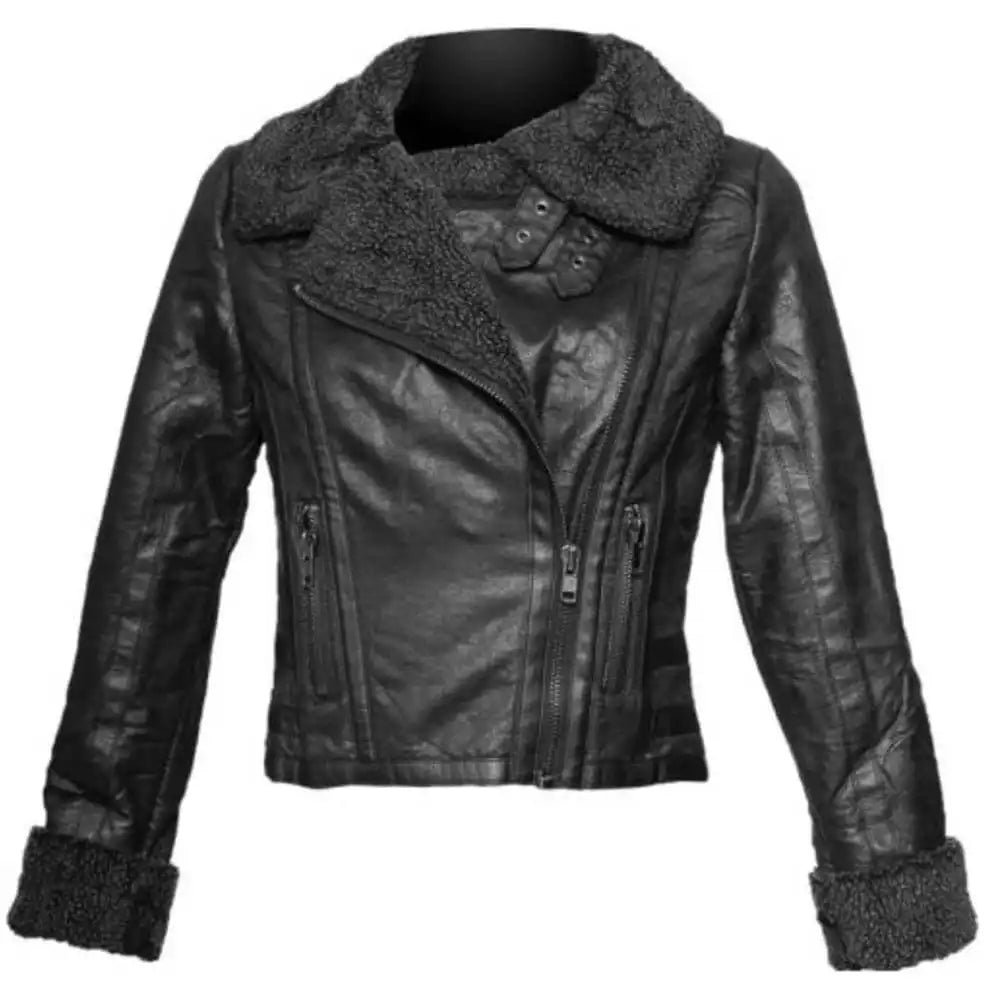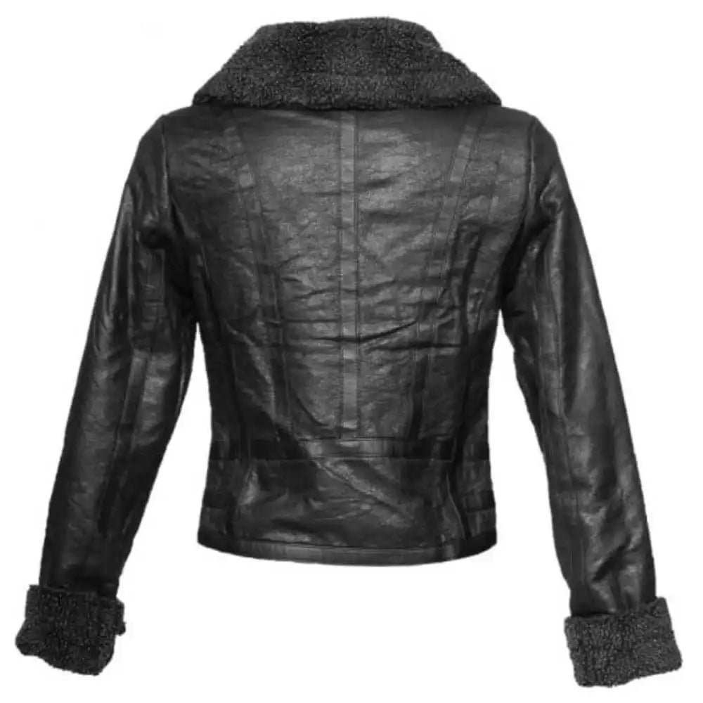 High Neck Collar Folded Cuff Black Fur Winter Leather Jacket Womens