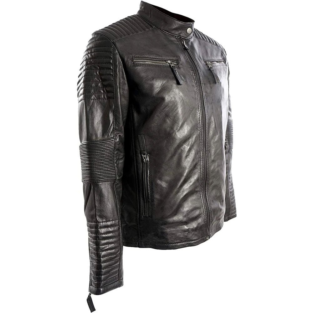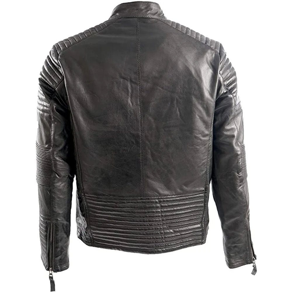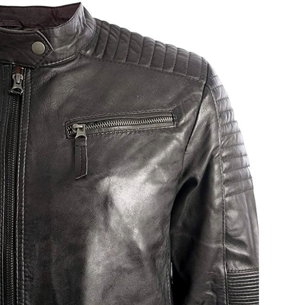 Padded Cafe Racer Retro Biker Genuine Leather Jacket Black Motorcycle Rider Coat.