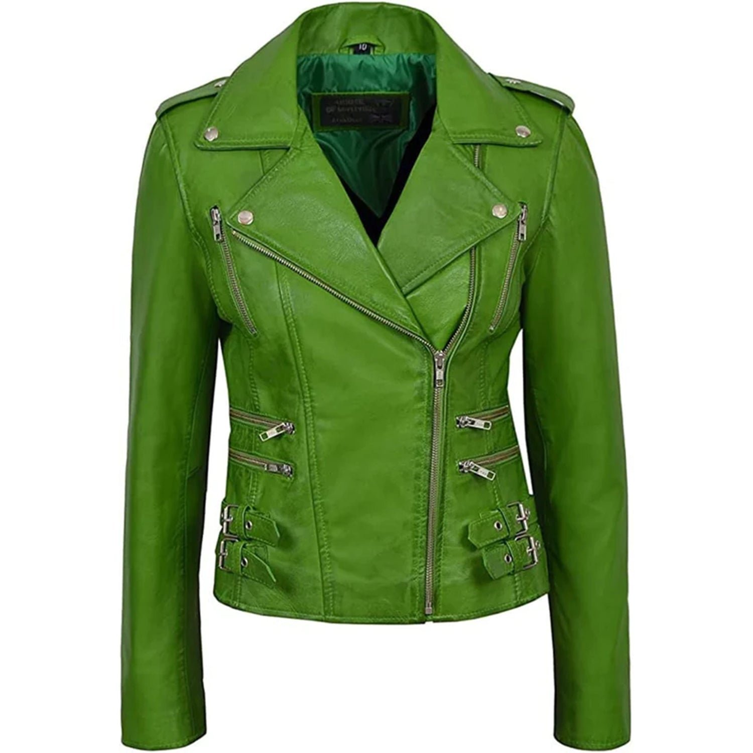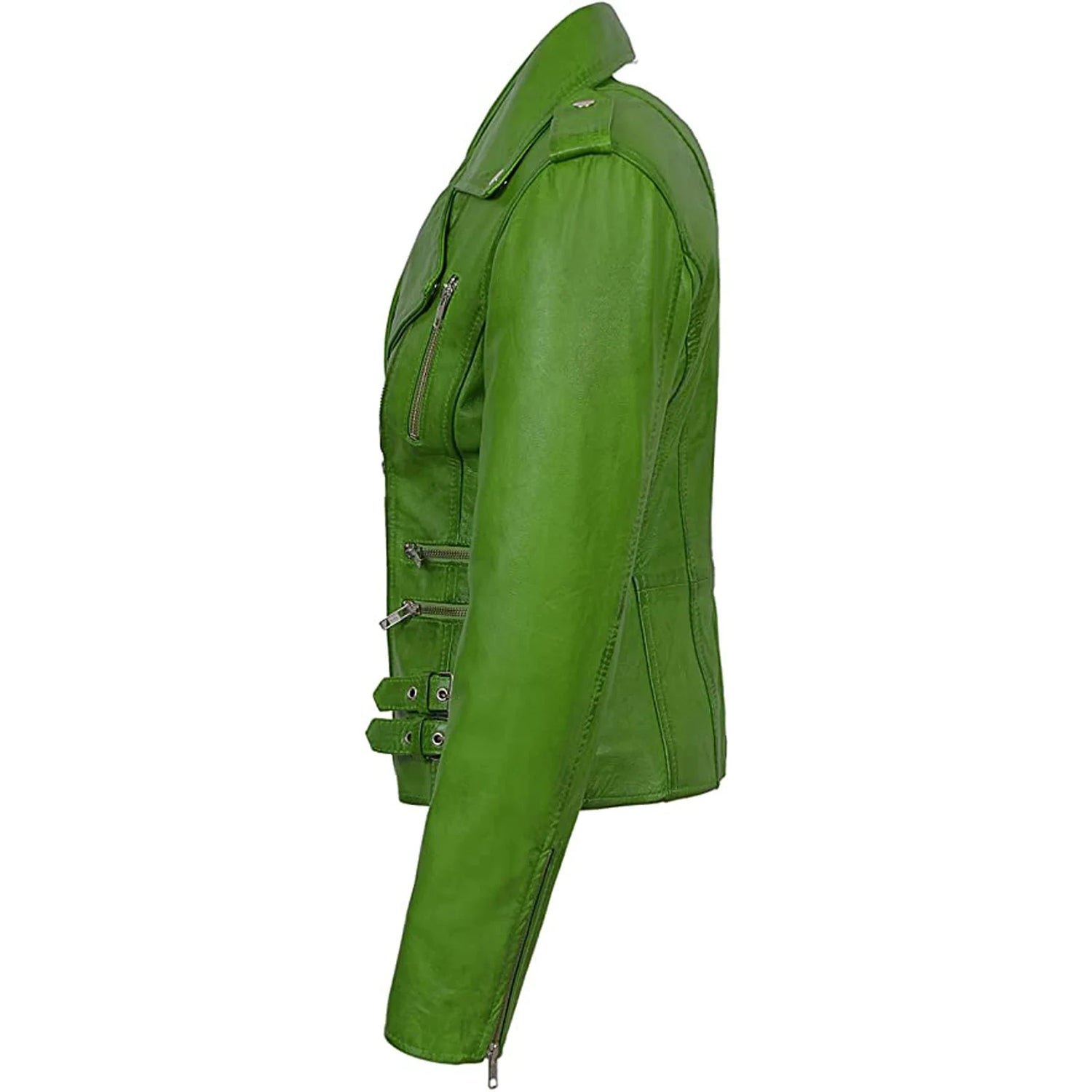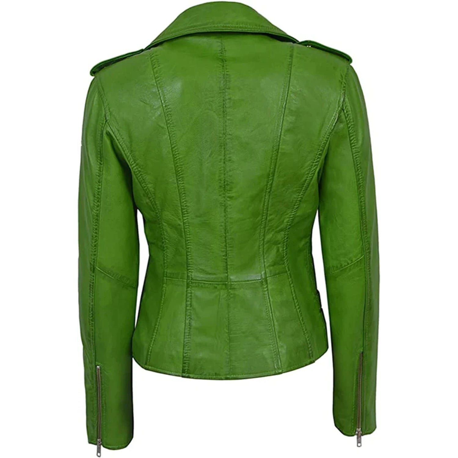Slim Fit Cropped Moto Biker Leather Jacket Wax Green Women