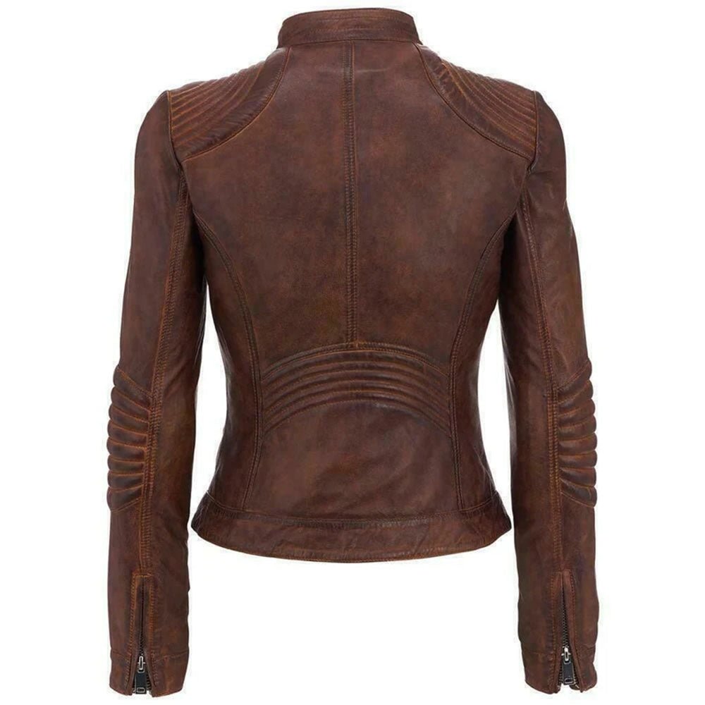 Wax Brown Vintage Cafe Racer Cropped Biker Leather Jacket Slim Fit Motorcycle Womens Coat.