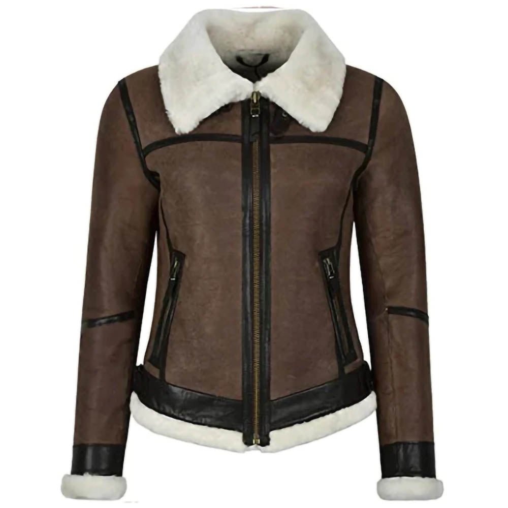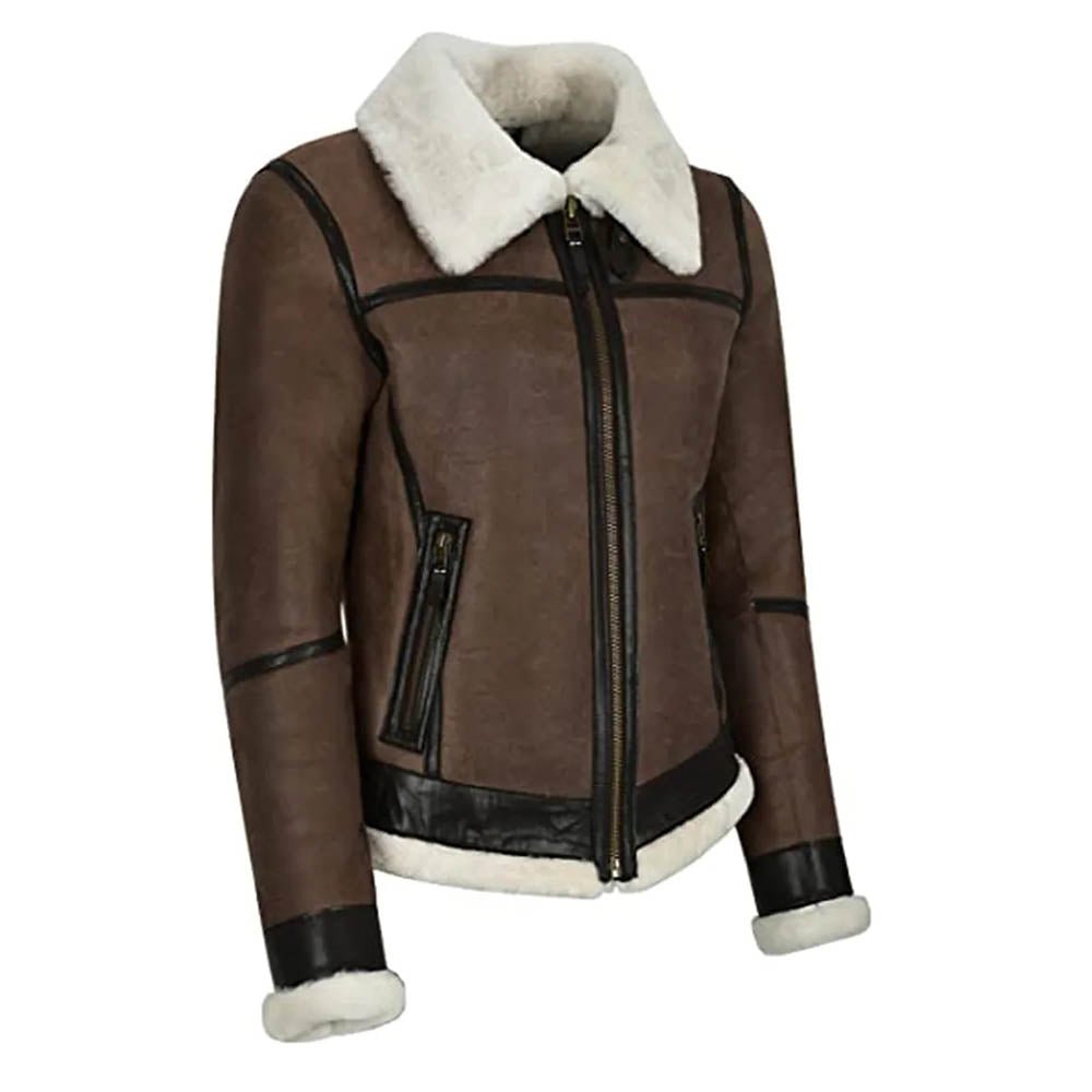 Womens Military Bomber B3 Fur Brown Real Leather Jacket.